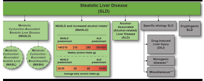 Lược đồ của SLD và các danh mục con. SLD, được chẩn đoán bằng mô học hoặc bằng hình ảnh, có nhiều nguyên nhân tiềm ẩn. MASLD, được định nghĩa là sự hiện diện của gan nhiễm mỡ kết hợp với một CMRF và không có nguyên nhân rõ ràng nào khác, ALD, và sự chồng chéo của cả hai (MetALD), bao gồm các nguyên nhân phổ biến nhất của SLD. Những người mắc MASLD và viêm gan nhiễm mỡ sẽ được chỉ định là MASH (trước đây là NASH). MASL đề cập đến sự hiện diện của MASLD khi không có viêm gan nhiễm mỡ. Trong nhóm MetALD, tồn tại một sự liên tục trong đó sự đóng góp của MASLD và ALD sẽ khác nhau. Để phù hợp với tài liệu hiện tại, các giới hạn đã được đặt ra phù hợp cho mức tiêu thụ hàng tuần và hàng ngày, hiểu rằng tác động của việc uống rượu là khác nhau giữa các cá nhân. Các nguyên nhân khác của SLD cần được xem xét riêng biệt, như đã được thực hiện trong thực hành lâm sàng, dựa trên các yếu tố thúc đẩy riêng biệt của chúng.